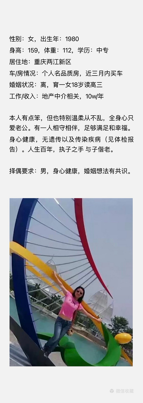 87年女士,净身高171cm,体重120,学历本科,住在主城。离异有女儿11岁,我父母帮带。央企上班,工作稳定,周末双休,税前收入20W以上。主城有房几套,父母央企退休。希望男士真诚善良脾气好(很重要),学历本科以上,体制内工作(最好是),经济条件相当(不能太差),年龄不超过45岁,有孩子的话希望有父母帮带,来信的先生请把自身的情况写得更具体一些。注:本人没有再生育的意愿,非诚勿扰!