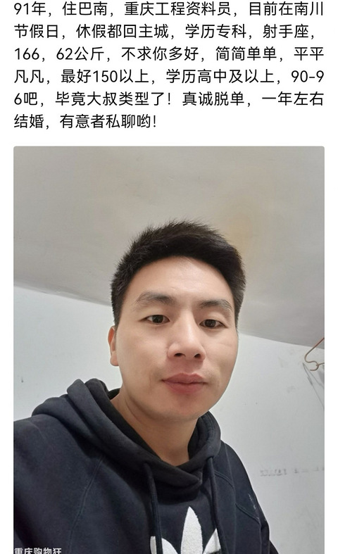未婚,37岁,身高185cm,体重78kg,硕士研究生,住江北(现在要叫两江新区了),体制内,工作和收入都比较稳定。有房有车,生活没什么负担,日子过得简单也踏实。性格方面,开朗好相处,但该稳重的时候也能沉得下来。喜欢沟通,也愿意倾听,觉得两个人在一起,真诚和包容比什么都重要。对事果断不拖沓,责任心强。爱好广泛,有一定阅读量,不是一个乏味的人。早年在企业工作,35岁上岸,对未来有规划。不吸烟,偶尔喝