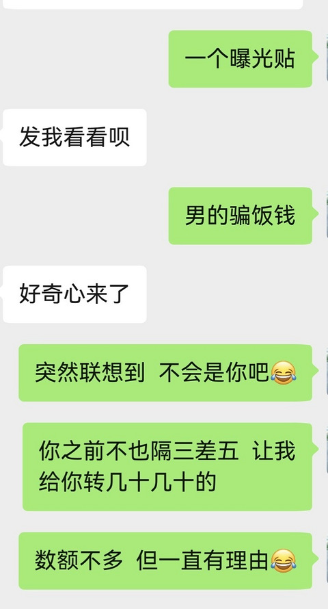 刚在论坛无意见刷到一篇帖子一个小姐姐发的关于一个男的借口吃饭借了189快钱不还,还打算第二次借钱没成功。小姐姐意识到后,也想办法要回来,但是呢最后发现被拉黑了突然想到 自己也被骗过几次碍于钱少,所以算了。也没报警我很信奉因果所以 至少和生死有关的事情,我都相信那些路边乞讨的,给过很多次钱就不说了毕竟那个被骗很正常离谱的被骗经历第一次应该是21年吧,疫情期间。线上联谊还没见面呢。前几天聊的好好的