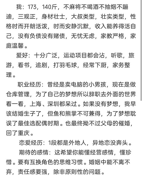 没有什么好说的。90年未婚 170 70kg 武隆人在重庆 平凡不能再平凡 普通不再普通 如果觉得有基本想要了解的 可以私聊 我可以发照片和基本信息给你 既然来了这里 就是想脱单 没有什么不好意思的 第一次相亲贴 我知道还有很多潜水的普通人 不成没事 认识既是朋友