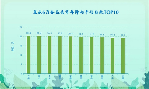 重庆的6月是多雨的时段,我们一起来看看往年6月各区县降雨有多频繁↓↓ 来自重庆气候监测分析平台数据显示,常年(1991~2020年)6月1日至6月30日,重庆各区县平均降雨日数均超过了16天,其中万盛、秀山、永川、酉阳、荣昌还达到了20天以上!沙坪坝的平均降雨日数为18.5天。