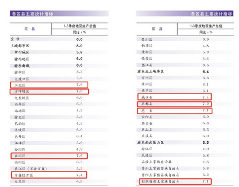第1眼-重庆广电消息,近日,重庆市统计局公布前三季度各区县主要统计指标。今年1-3季度地区生产总值,全市同比增长达到6%,主城都市区、中心城区、渝西地区和渝东新城分别为5.9%、5.8%、6.0%、6.0%。同比增长超过7%的为江北区、永川区、万盛经开区、城口县、丰都县、忠县、彭水苗族土家族自治县和沙坪坝区。其中,江北区和永川区同比增长均达到了7.6%。 各区县主要统计指标具体如下: