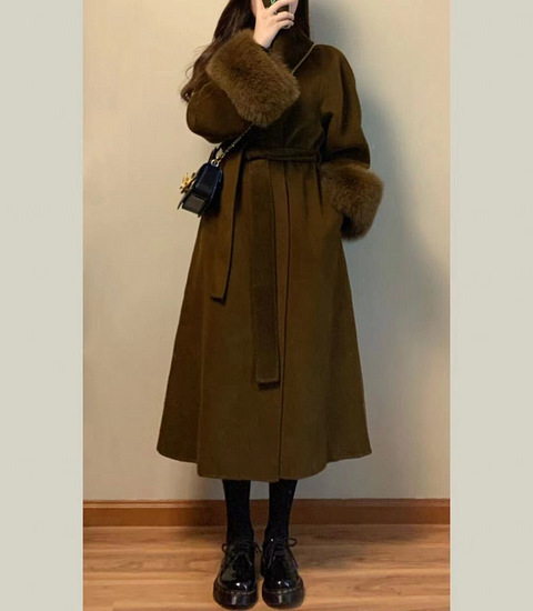 焦糖棕气质,无领优雅,整体有气场却不具有攻击性,绑带敞开都好看袖口的毛毛厚实有质感 看起来像个小富婆内搭选了修身的高领针织和半身裙,气质大衣:tina fairy