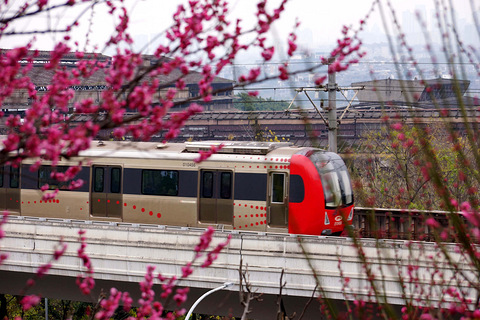 1号线石井坡站出站往磁器口方向有一个江山公园,公园山坡上有大片红梅,可以拍到开往春天的列车。