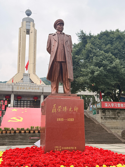 聂荣臻元帅陈列馆前铜像广场上的坦克和战斗机 反映长征境况的雕塑纪念章聂帅使用过的箱子日式手枪平津战役指挥之一当选北京市长与科学家畅谈我国第一颗原子弹爆炸实验用触发管原子弹模型长征一号核潜艇毛泽东的评价陈列馆环境很好