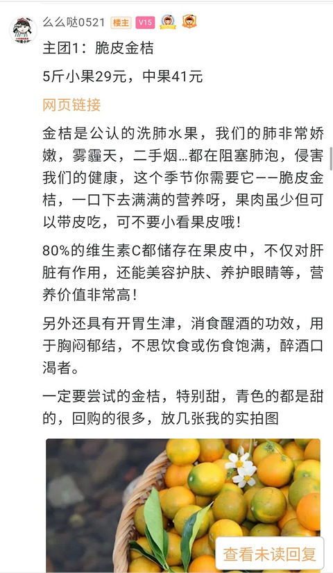 团购链接:【金桔,圣女果,奶枣,橙子,猕猴桃,薯片等零食专场+十二月团大】:https://go.cqmmgo.com/wap/forum-176-thread-173371609375484361-1-1.html?openType=0fr=19louapp_share_copyurl老板刚才发给我的,金桔果园做活动团价中果5斤,价格41元现在,中果6斤,价格36元,重庆顺丰包邮个头比小果大一