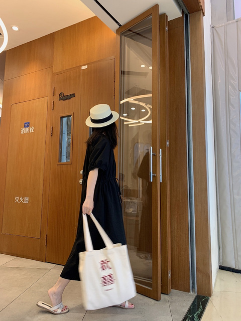 这条小黑裙加上帆布包,就是绝绝子!! 夏天帆布包都太好看啦,也超级喜欢这上面的字~~日子欢欢喜喜