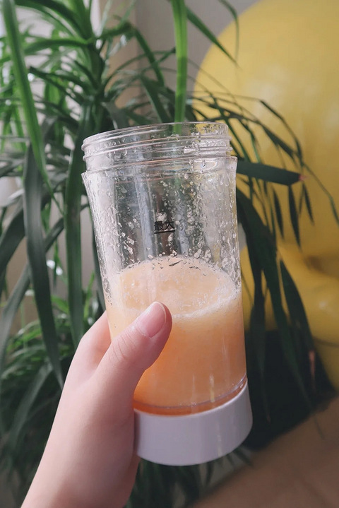 它的搅拌力度虽然比不上那些大几百的榨汁机榨出来的果汁口感细腻,声音也不大。榨完倒过来,拿走底座就能直接喝。清洗起来也很方便,按两下,它就会开始认真地自己洗自己了!