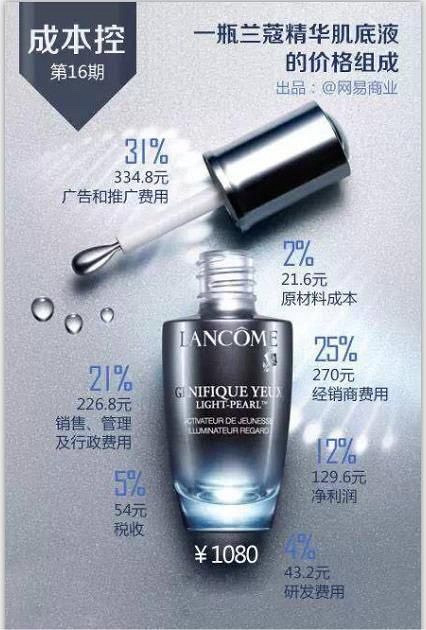 网上看到雅诗兰黛(上海)商贸有限公司新增一则行政处罚,处罚事由为虚假或者引人误解的商业宣传,处罚结果为罚款40万元,高价化妆品的溢价非常严重,看这个兰蔻小黑瓶的价格组成图就知道 所以宣传效果都是被夸大的吧,还有各种网红明星背书.........你们觉得高价化妆品是「智商税」吗