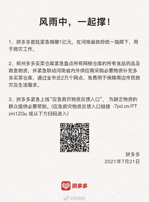 厉害了!拼多多宣布首期捐款1亿元,驰援河南抗灾
