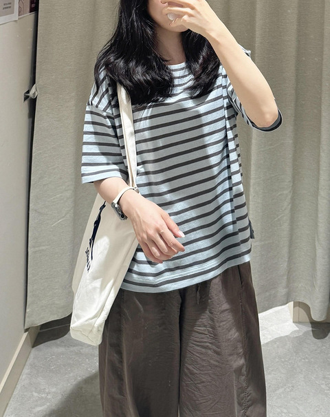 Muji上新的这件薄荷巧克力一字领条纹太戳我了!比去年巧克力条纹长t更美丽的配色,Muji是懂夏天的!是宽松带点蝙蝠袖的设计,对身材包容性很强,微胖的姐妹也不怕。缺点就是这种材质稍微没这么亲肤,但是148的价格暂且原谅它一下吧~