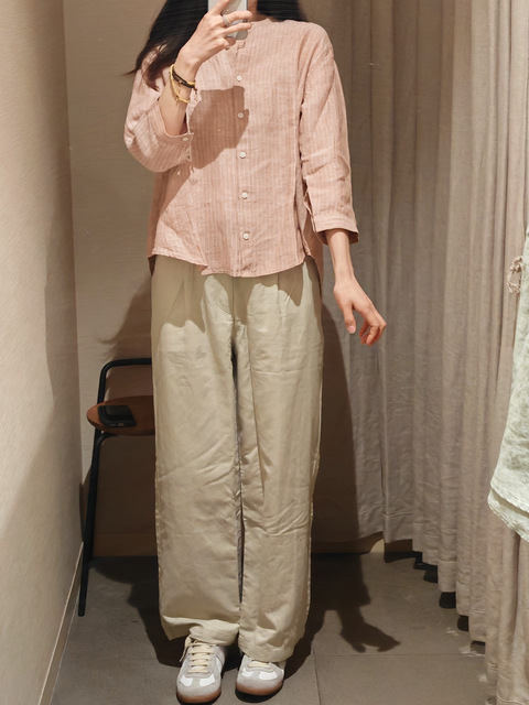 MUJI的调色真的无敌了!试了几套都很满意汉麻七分袖罩衫的深橙色条纹真的很爱,衬的人温温柔柔水水的,搭配亚麻裤子,走路带风啊,过段时间热了穿肯定舒服的很!