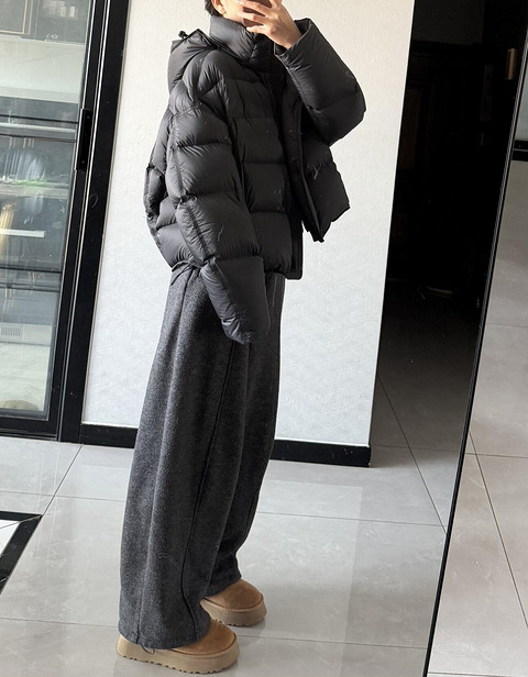 最近抖音被波司登的泡芙霸屏了,天天刷到都没在线上买。前几天逛街发现实体店也有这个款,上身一试还挺合身的就买了。今天搭了两条不同的裤子试了一下,发觉还是下身得穿宽松一点好看。