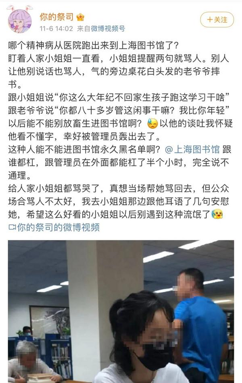 综合上海新闻广播、今日头条拍客、@你的祭司 图书馆本是不能喧哗的清净之地,如今却出现了奇怪的人。网友称一男子出现在上海图书馆盯着女读者看,当事女子不满并进行提醒后,该男子起身大声质问女子:“这么大岁数了不回家生孩子在这学习干啥?”最早曝光这名男子的博主表示该男子无差别语言攻击在场读者。“小姐姐提醒两句就骂人,别人让他别说话也骂人。”