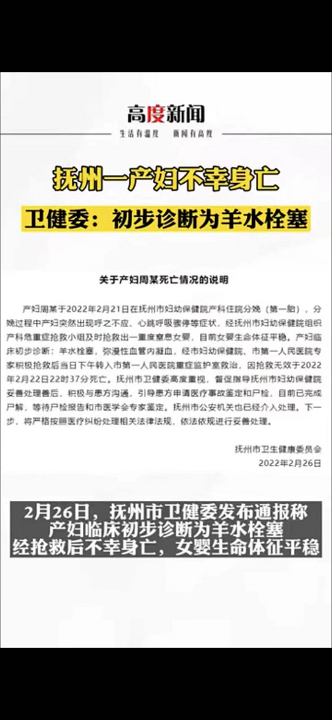 抚州一产妇不幸身亡,卫健委:初步诊断为羊水栓塞