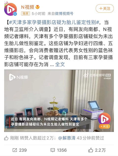 性别鉴定在我们国家一直是违法的,不会还有人不知道吧?请狠狠罚!!! 【#天津多家孕婴摄影店疑为胎儿鉴定性别#,当地有卫监所介入调查】近日,有网友向南都、N视频记者爆料,天津有多个孕婴摄影店铺疑似为未出生胎儿做性别鉴定。这些店铺为孕妇进行四维、五维摄影后,会向消费者赠送代表男女性别的蓝色袜子和粉色袜子。记者调查发现,目前有三家孕婴摄影店铺可能存在为消费者提供鉴定胎儿性别的服务,并有店家已明确表达可提