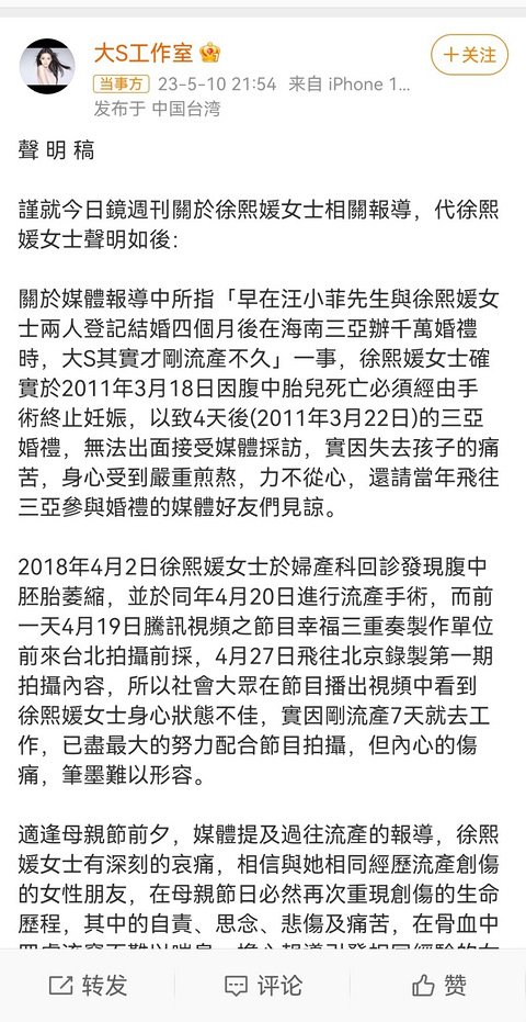 昨天网上爆料大S不止一次流产,晚上大S回应了 同时表示:“这段期间,因离婚事件,浪费了非常多的社会资源,深感抱歉;因此无论网暴、霸凌,徐熙媛女士没有逐一澄清,是因希望事情可以尽快平息,回归平静,一切该走法律程序的部分也都交由律师事务所处理,今日周刊报导的出处来源并非来自大S工作室,发此声明只是不希望大家以讹传讹,以正视听。”