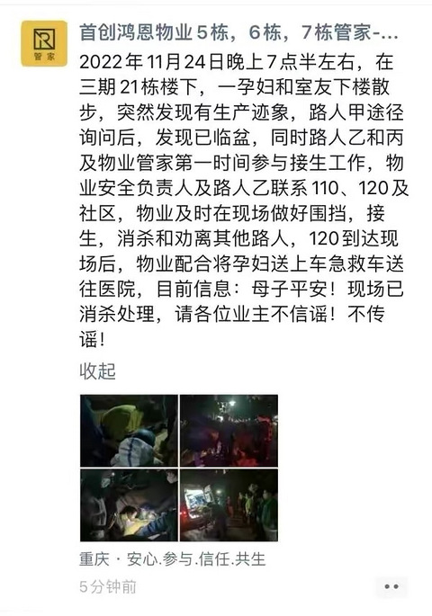 上观新闻 11月24日晚,一条“重庆一小区孕妇在路边生产”的朋友圈截图在网络上流传,并称孕妇在生产中去世。截图中这位发言的女士自称是妇产科医生,她说起当时的经历:于晚间7点26分接到邻居电话准备下楼,愿意帮助产妇生产,但因为疫情管控不能下楼出门。最后她发出感慨:“从医17年,第一次就这样看着产妇路边毫无保护地生产,自己无能为力……”随后,舆论在小范围内传播,不少人指责疫情防控不近人情。但事态很快发