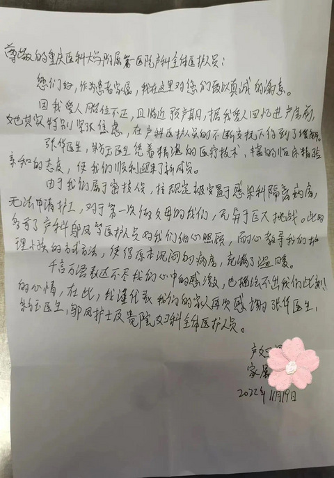疫情期间,孕妈妈们太不易了! 分享自重医大附一院产科 病毒无情,人间有爱。疫情特殊时期,能够平安顺利分娩无疑让所有的孕妈妈们都如释重负,让之前的紧张焦虑都变为欢喜与感恩,而这些的背后,是医务人员无数个日夜的坚守,是防护服下 衣衫湿透换来的。 “是你们让原本沉闷的隔离病房,充满了欢喜和温暖。 ”产妇家属在感谢信中写道。15日上午11点,我科张华主任接到急诊科电话通知,急诊来了一个阳性密接孕39+3周