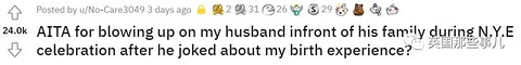 转自英国那些事 几天前,Reddit的“AmItheAsshole”(我是不是混蛋)版块出现了一个帖子,引起了网友们的兴趣。 帖子的题目叫做,“老公拿我的生产经历开玩笑,我在新年夜当着他家人的面跟他吵翻了,我是不是混蛋?”