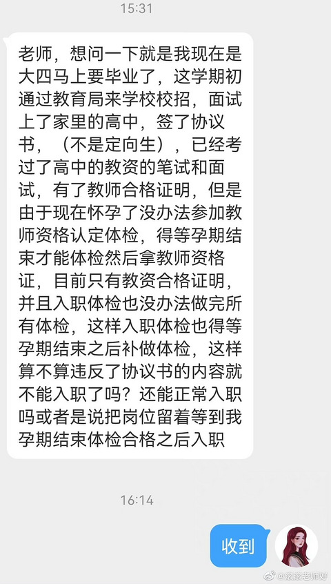 网上看到一个女生的提问,这种能入职不哟 老师,想问一下就是我现在是大四马上要毕业了,这学期初通过教育局来学校校招,面试上了家里的高中,签了协议书,(不是定向生)。 已经考过了高中的教资的笔试和面试,有了教师合格证明,但是由于现在怀孕了没办法参加教师资格认定体检,得等孕期结束才能体检然后拿教师资格证,目前只有教资合格证明,并且入职体检也没办法做完所有体检,这样入职体检也得等孕期结束之后补做体检。 这