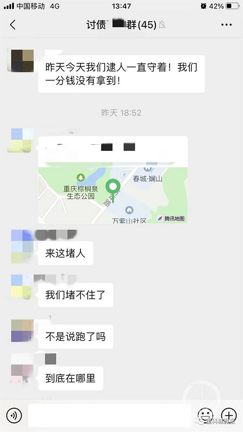 转自重科城微报 “逮到人了,快点来,我们怕堵不住。”3月1日傍晚6点多,一条配有定位的消息在微信群里响起,群中40余人激动起来。已怀孕4个月的滕女士顾不得吃晚饭,急忙出了门。 前往目的地的路上,滕女士联系了上游新闻记者,通过电话,她告诉记者微信群里这帮人的共同目的:讨债。