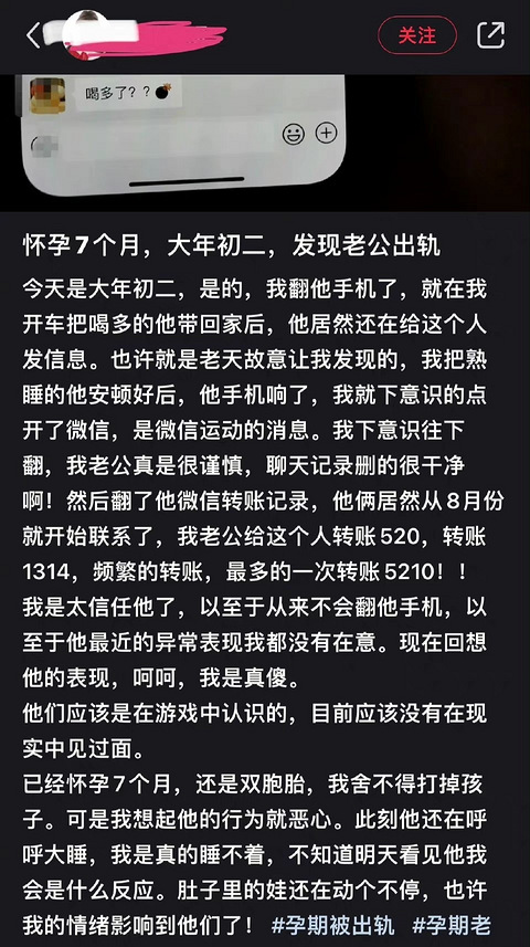 在网上看到一个孕妈妈,说过年发现老公出轨了,还频繁转账男的坦白身体没有出轨只是骚聊,但是,这样难道就不恶心?