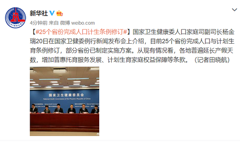 新华社微博 【25个省份完成人口计生条例修订】国家卫生健康委人口家庭司副司长杨金瑞20日在国家卫健委例行新闻发布会上介绍,目前25个省份完成人口与计划生育条例修订,部分省份已制定实施方案。从现有情况看,各地普遍延长产假天数,增加普惠托育服务发展、计划生育家庭权益保障等条款。(记者田晓航)