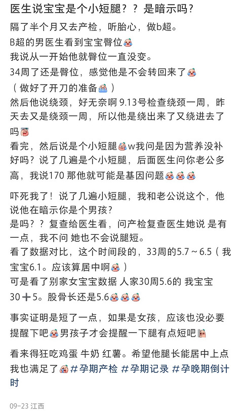 医生几次告知小孩腿短。 一般人听后反应:孩子可能身高不高。 小作文作者听了以后的反应是:医生在暗示我这是个男孩。 ???