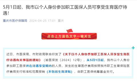 近日,市医保局、市财政局联合印发了《关于以个人身份参加职工医保人员享受生育医疗待遇有关事项的通知》(渝医保发〔2024〕12号),从5月1日起,我市以个人身份参加职工医保并在待遇享受期内的人员,发生的生育医疗费用按照我市职工生育保险医疗费用支付标准和范围报销(不包括生育津贴),由职工医保统筹基金支付。