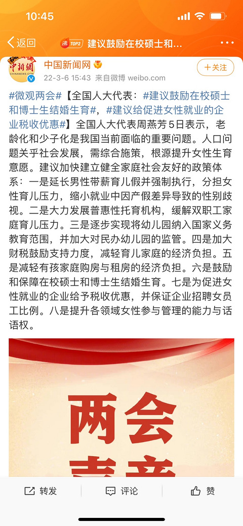 【全国人大代表:#建议鼓励在校硕士和博士生结婚生育#,#建议给促进女性就业的企业税收优惠#】全国人大代表周燕芳5日表示,老龄化和少子化是我国当前面临的重要问题。人口问题关乎社会发展,需综合施策,根源提升女性生育意愿。建议加快建立健全家庭社会友好的政策体系:一是延长男性带薪育儿假并强制执行,分担女性育儿压力,缩小就业中因产假差异导致的性别歧视。二是大力发展普惠性托育机构,缓解双职工家庭育儿压力。三是
