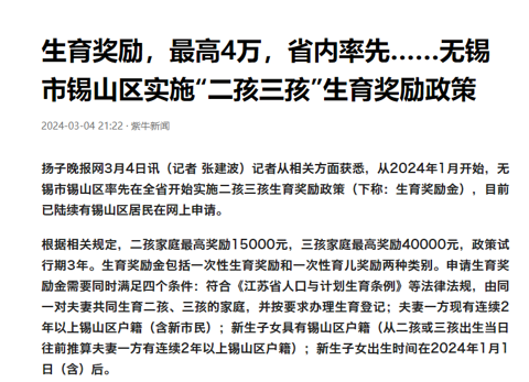 扬子晚报网3月4日讯(记者 张建波)记者从相关方面获悉,从2024年1月开始,无锡市锡山区率先在全省开始实施二孩三孩生育奖励政策(下称:生育奖励金),目前已陆续有锡山区居民在网上申请。