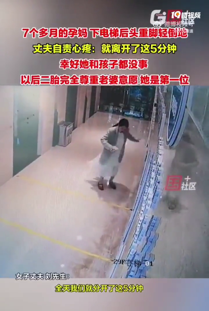 近日,重庆,一位怀孕7个月的孕妈下电梯后头重脚轻重重摔倒在地……幸好孩子和大人都没事。丈夫随后心疼自责:只离开了5分钟,没有基础疾病和问题,医生也说这个没办法,只能多陪伴。“以后二胎尊重老婆意愿,她是第一位!”