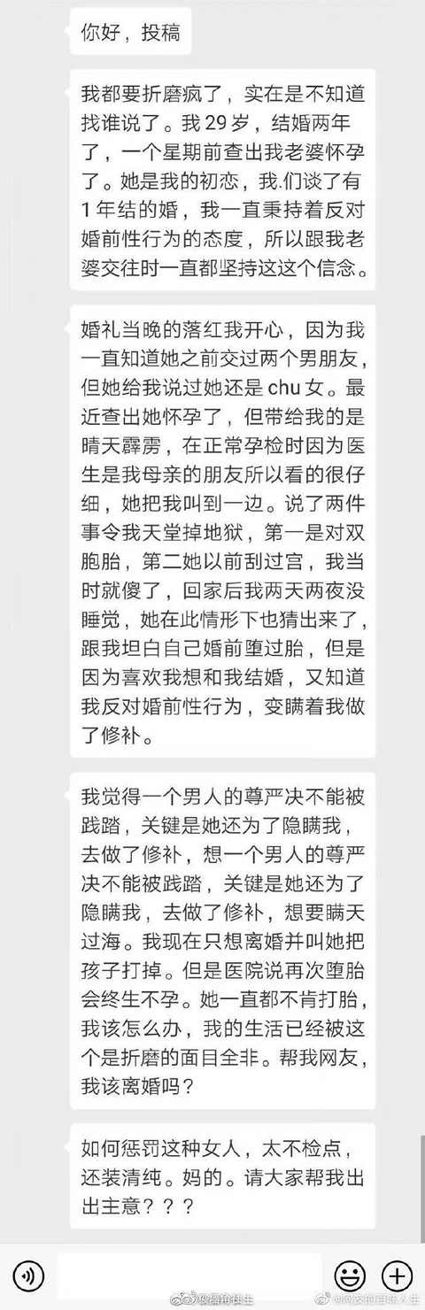 在网上看到一位网友求助:老婆结婚当晚落红是个处, 最近怀孕检查身体,医生和我说她以前刮过宫。。我要离婚但是医生告诉我再次堕胎会终身不孕。。。我该怎么办,离婚吗? 大家帮我出出主意如何惩罚这样的女人! ?好,大家可以骂了