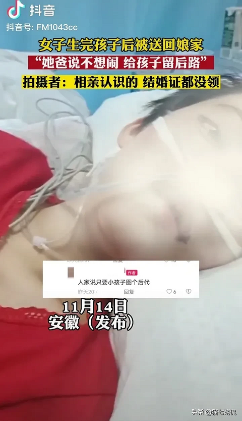骗女人子宫生小孩,现实版去母留子!!看到这个新闻,我都裂了!怎么会有这么坏的人?安徽一女子生了小孩后被送回娘家,她被骗婚了,不,不是骗婚,她是被骗了子宫生小孩,也就是说她被当成了生育工具。 据视频拍摄者说:女子和男方是相亲认识,两人还没领证就生了小孩。孩子出生后,女人被“婆家”送回了娘家,孩子留在了“婆家”。女子被送回来后,“婆家”就不管了,还说女人住院花了钱,女子的父亲也不准备去找“婆家人”理论