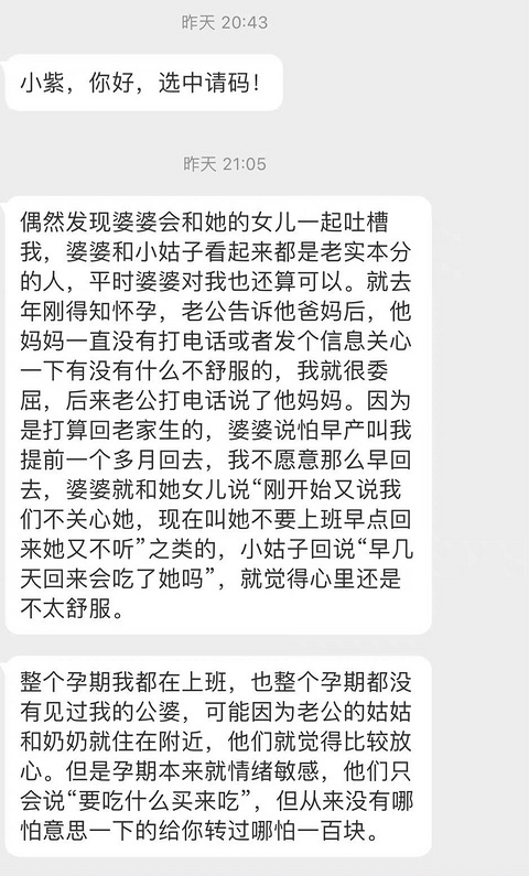 来自网友发文,说偶然发现婆婆会和她的女儿一起吐槽我,婆婆和小姑子看起来都是老实本分的人,平时婆婆对我也还算可以。就去年刚得知怀孕,老公告诉他爸妈后,他妈妈一直没有打电话或者发个信息关心一下有没有什么不舒服的,我就很委屈,后来老公打电话说了他妈妈。 因为是打算回老家生的,婆婆说怕早产叫我提前一个多月回去,我不愿意那么早回去,婆婆就和她女儿说“刚开始又说我们不关心她,现在叫她不要上班早点回来她又不听”