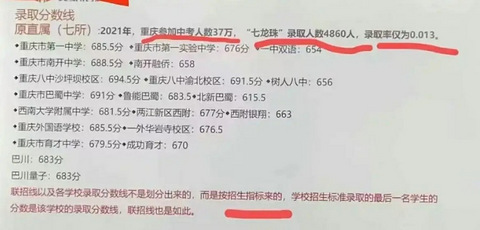 不知道这个数据准不准? 2021年,重庆参加中考人数37万,“七龙珠”录取人数4860人,录取率仅为0.013 重庆市第一中学:685.5分重庆市第一实验中学:676分 一中双语:654 重庆南开中学:688.5分南开融侨:658 重庆八中沙坪坝校区:694.5分八中渝北校区:691.5分,树人八中:656重庆市巴蜀中学:691分鲁能巴蜀:683.5北新巴蜀:615.5 西南大学附属中学:681.
