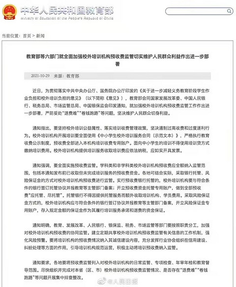 为深入贯彻落实中共中央办公厅、国务院办公厅印发的《关于进一步减轻义务教育阶段学生作业负担和校外培训负担的意见》(以下简称《意见》),有效防范“退费难”“卷钱跑路”等损害群众利益的问题发生,近日,教育部、国家发展改革委、中国人民银行、税务总局、市场监管总局、中国银保监会联合印发《关于加强校外培训机构预收费监管工作的通知》 近年来,一些校外培训机构无序扩张,片面追求发展规模,大量资金用于销售与广告,开