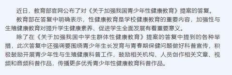 教育部:积极鼓励开展青少年性与生殖健康科普工作
