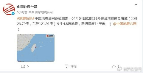 【#台湾花莲今日已连发4次余震#】中国地震台网正式测定:04月04日02时29分在台湾花莲县海域(北纬23.79度,东经121.91度)发生4.8级地震,震源深度14千米。