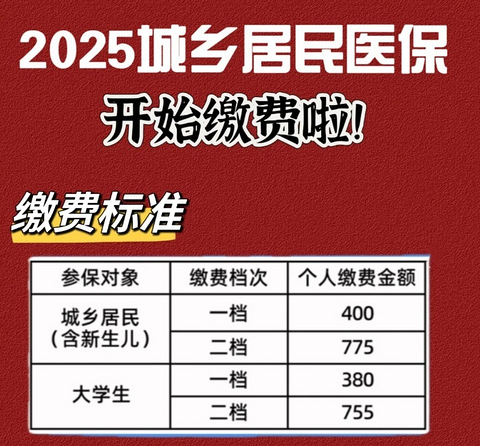 即日起至2024年12月31日,市民可以缴纳2025年度城乡居民医保费。2025年重庆市个人缴费标准为一档400元,二档775元。