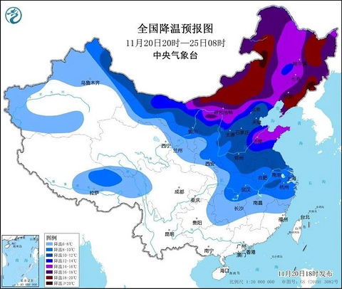 11月20日18时,中央气象台发布寒潮黄色预警和大风蓝色预警,东北迎今冬第三轮强降雪,新疆内蒙古等地部分地区将有8级阵风。同时,中国气象局于20日18时启动三级应急响应。 11月以来第二次寒潮过程来袭 这些地方降温或超16℃ 11月以来,影响我国的冷空气较为频繁,已先后经历三次过程(4-7日、9-12日、15-17日),其中4-7日过程达到寒潮级别,为此中央气象台发布今年下半年首个寒潮蓝色预警。预