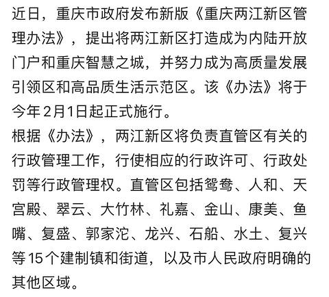 《重庆两江新区管理办法》即将于2024年2月1日起施行。