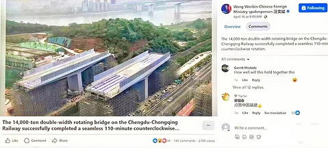 近日在重庆市大渡口区钓鱼嘴片区总重1.4万余吨公路双桥完成上跨成渝铁路转体施工的视频在社交软件上得到外交部发言人汪文斌的点赞