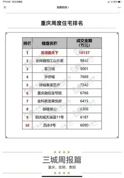 老是看到很多人没事都在给重庆分区,一会说北区是重庆核心,一会又踏雪南区乡下人,正好就看到一个统计,统计了最近春节重庆楼盘的成交金额,南区北区西区都在,要是北吹,数据上也没见北区霸榜,也没卖得过南区的龙湖嘉天下,西区富力城这边也在榜上 而且大家都晓得,过年期间,大家都在家走亲戚打麻将,基本上都是超级淡季,房地产是最容易暴露价值的时候,这时候的销售基本上可以说是真实情况,而且南区也并不差,生活配套,环