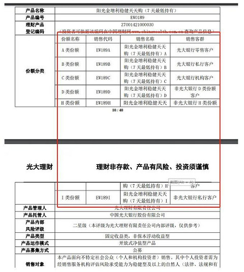 最近在中信银行买了光大的一款理财【阳光金增利稳健天天购(7天最低持有)】,由于到(8月17日)为止,看到净值才更新到8月12日,因此就上光大银行网站查一下新净值。一查才发现,历史净值和中信银行显示的不一样。再留意一下,发现是理财产品后序字母不一样。然后仔细查了一下。 根据 【阳光金增利稳健天天购(7天最低持有)】的《理财说明书》,该理财产品分为6个销售渠道,我购买属D类客户(中信代销),H类就不知