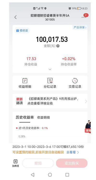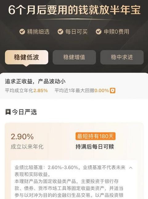 还好已经脱坑了,至此钱都不想存在招商银行了!恶心的一批,宣传页面不告诉你最近的收益率,说什么从成立以来年化收益!估计也是知道把真实的情况发出来不会有人买!水分超级大,一个低风险理财,中途还不让赎回,本金都差点搭进去!放活期存款都比半年宝多!大家避雷!