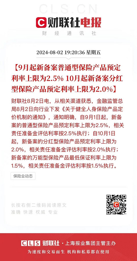 文件通知已经下发,从下月开始新批复上市的保险产品:健康类保险(重疾、人寿)涨价,理财类保险(年金、增额寿)预定预定利率从现在的3.0%降到2.5%,分红型保险产品从2.5%利率降到2.0%……现在市场在售产品陆续“闪电”下架,毕竟理财类保险对于银行利率普遍只有2.几%,国债又不好抢的情况下还是有明显优势的如果近期有配置计划要安排上日程了