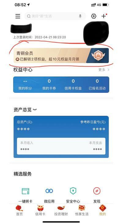 首先在“我的”页面,如下图,点青铜会员,要是没有这个模块的,也可以直接在搜索栏搜索手机银行会员