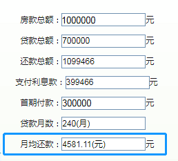 假设一套房子,总房款包含税费100万,首付包含税费30万,贷款70万,20年,等额本息。如图,每月还款4581.11元。